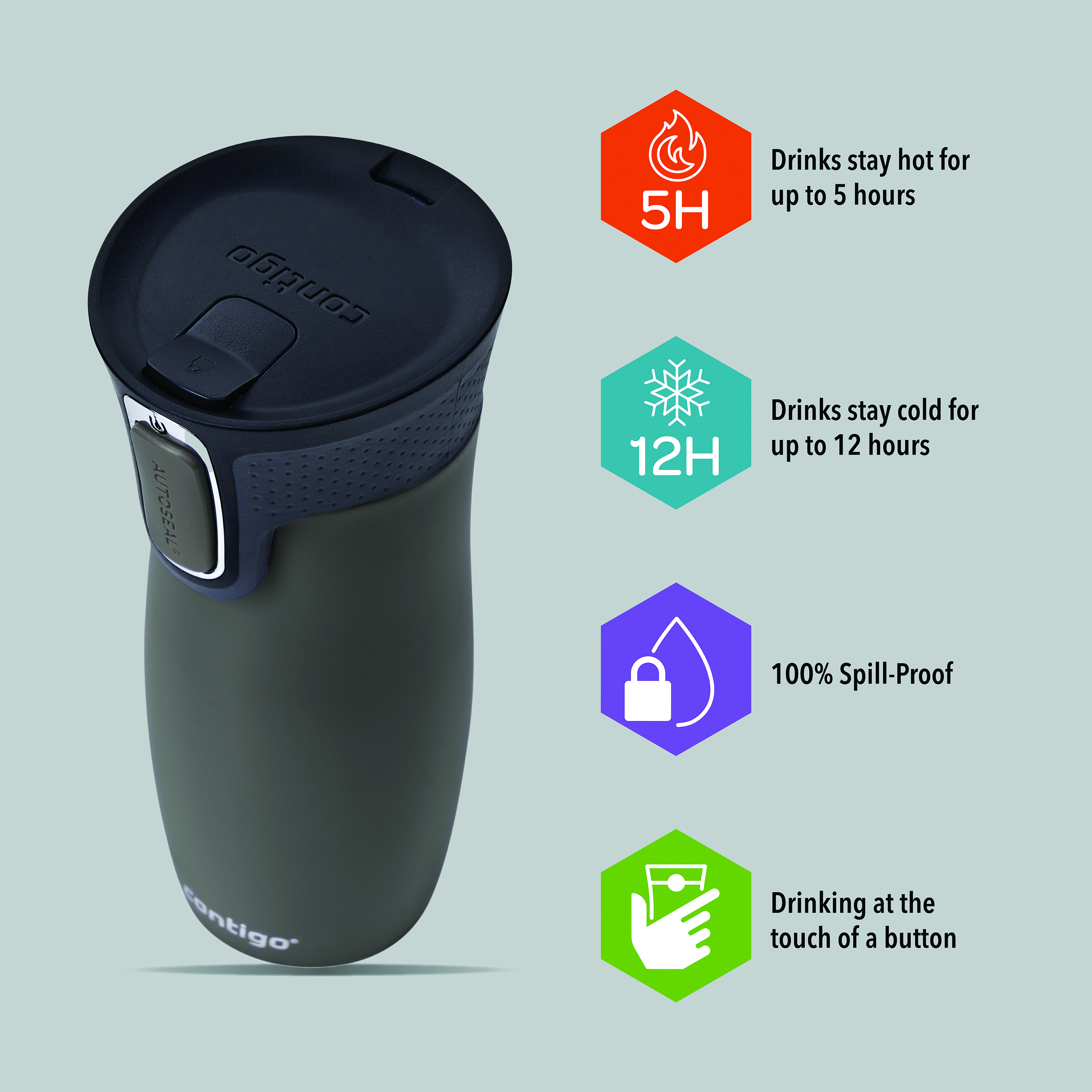 - Push button to drink and release to automatically seal the lid