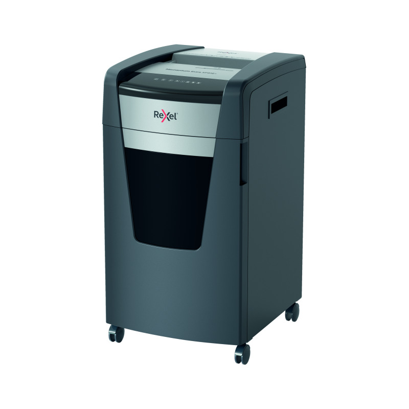 Rexel Momentum Extra jam free paper shredders are ideal for destroying confidential documents in the office. The XP516+ shredder machine shreds up to 16 sheets of A4 paper (80gsm) in one go through the manual feed slot into P-5 (2x15mm) cross-cut pieces. Active sensing technology measures the number of sheets being fed in real-time to stop paper jams and misfeeds; indicated by a red LED on the control panel. This paper shredder will not operate until the number of sheets is reduced below or at the maximum sheet capacity. This cross-cut shredder is designed for moderate to heavy use with its high sheet capacity, large 85L bin size and continuous run time. There is no need to manually feed paper or remove staples and paper clips first. This Rexel shredder also safely shreds CDs, DVDs and credit cards through a separate feed slot.